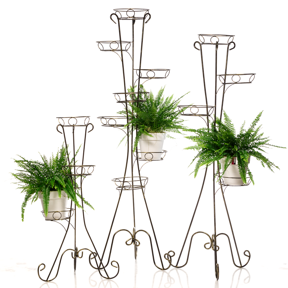 Стойки для цветов. Высота таких подставок до 170 см с количеством корзин от 3 до 9 штук. Представлены стойки в различных вариантах покраски: белый, черный, белый с золотом, черный с золотом.