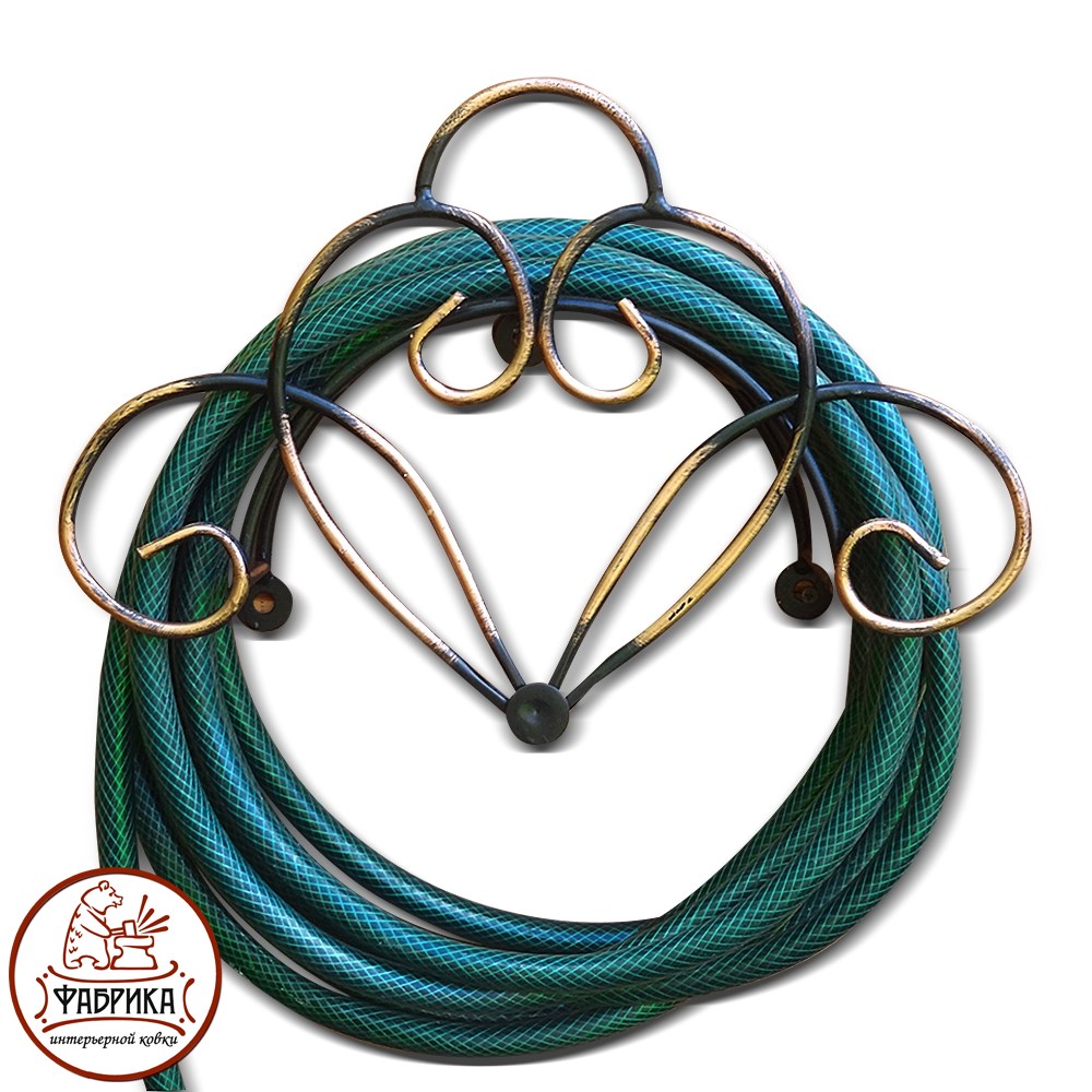 Держатель шланга 54-604 выполнен из металла. Покраска черная с патиной. Ажурные элементы делают его не только функциональным, но и эстетическим. Выполняя роль украшения, такой подвес для хранения шлангов можно установить на стене дома.