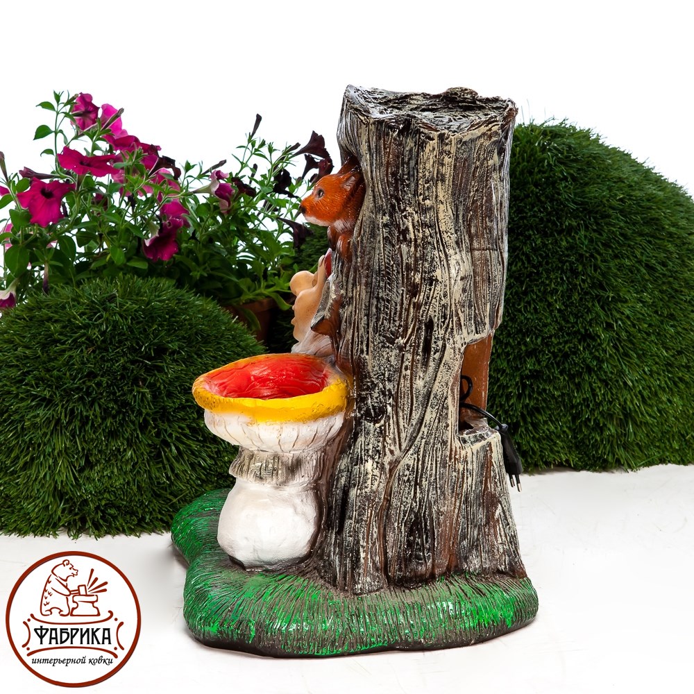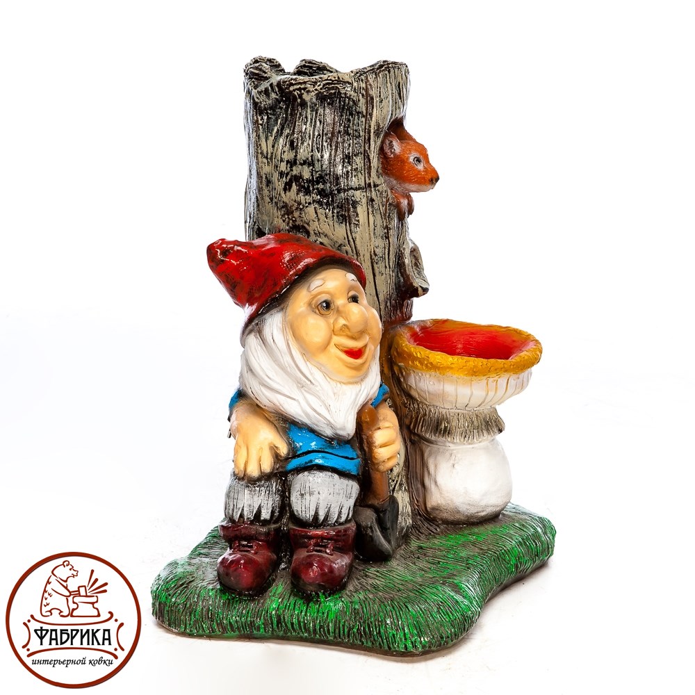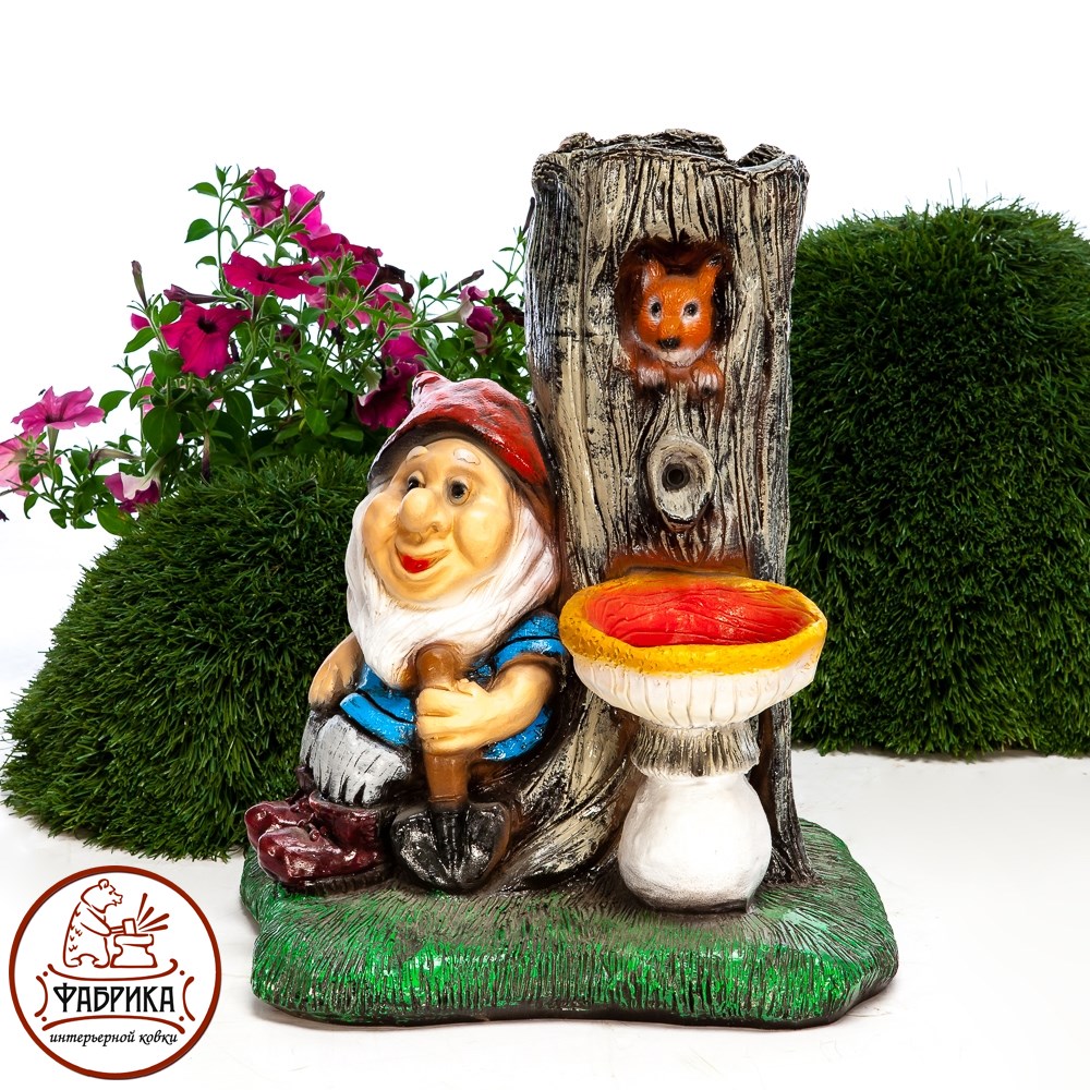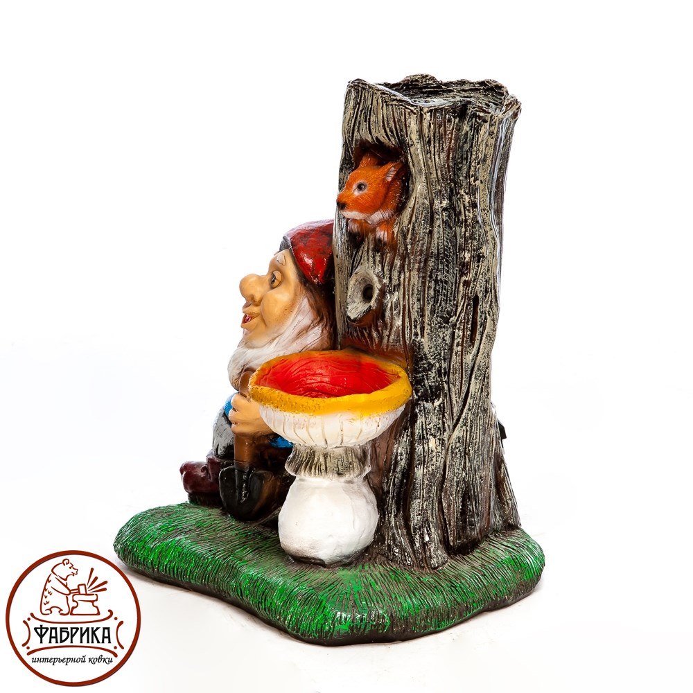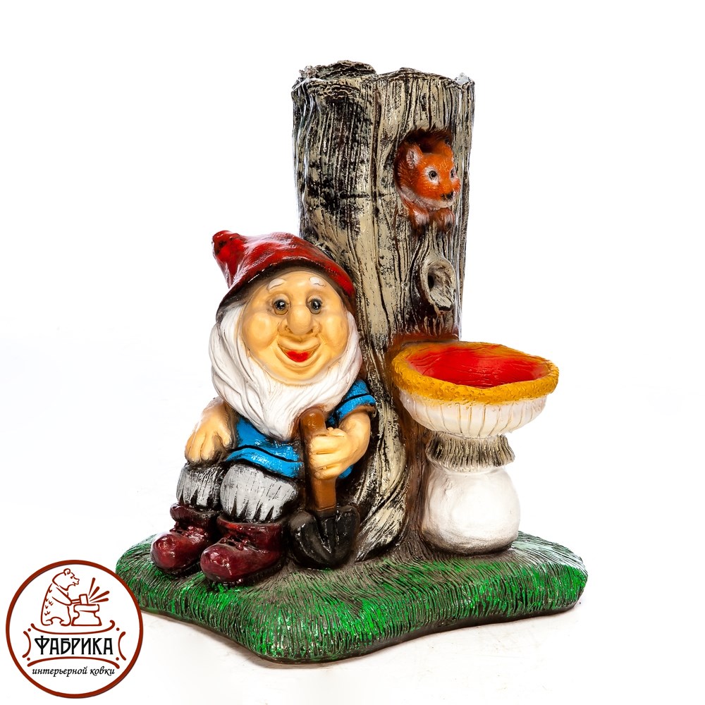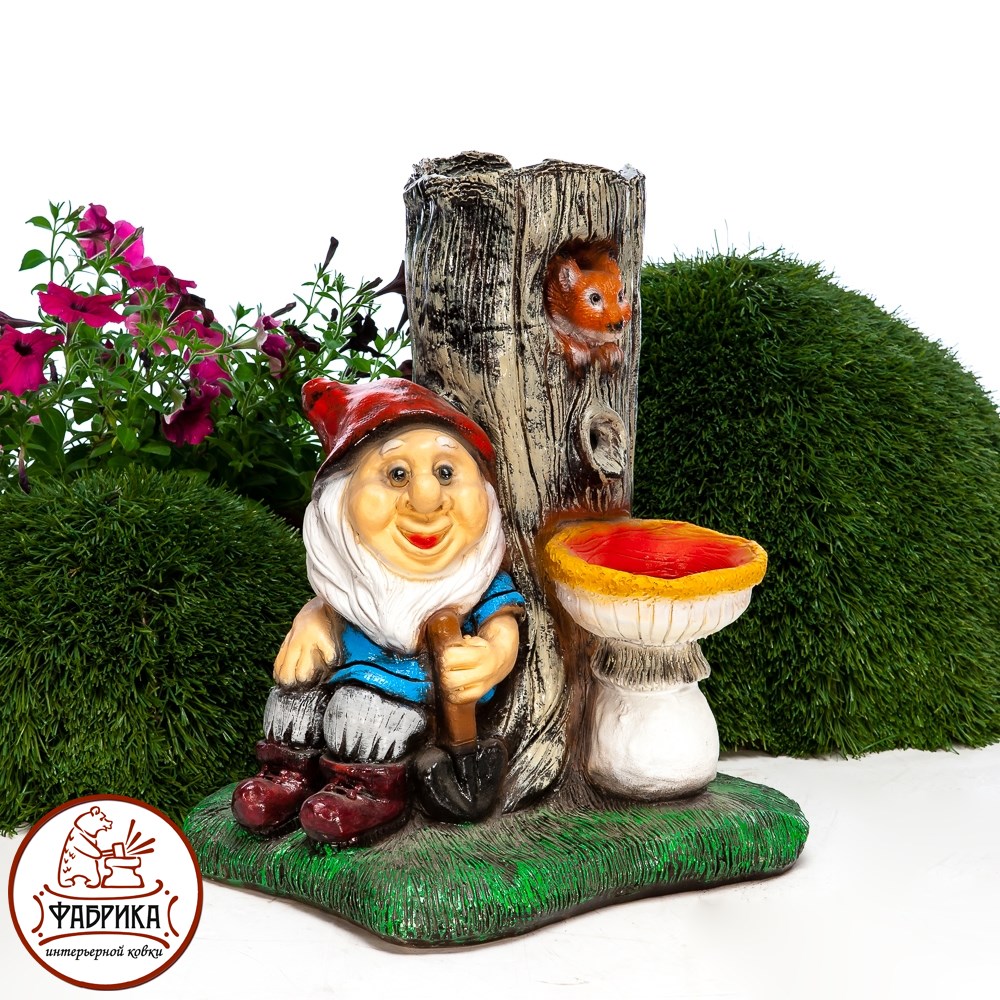 Декоративный фонтан с гномом. Материал изготовления: стеклопластик.  Предназначен для установки на садовом или дачном участке. Для подключения и установки необходимы электичество и вода. Работает от сети 220V.