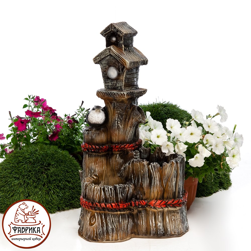 Декоративный фонтан Скворечник. Материал изготовления: стеклопластик. Предназначен для установки на садовом или дачном участке. Для подключения и установки необходимы электичество и вода. Работает от сети 220V.