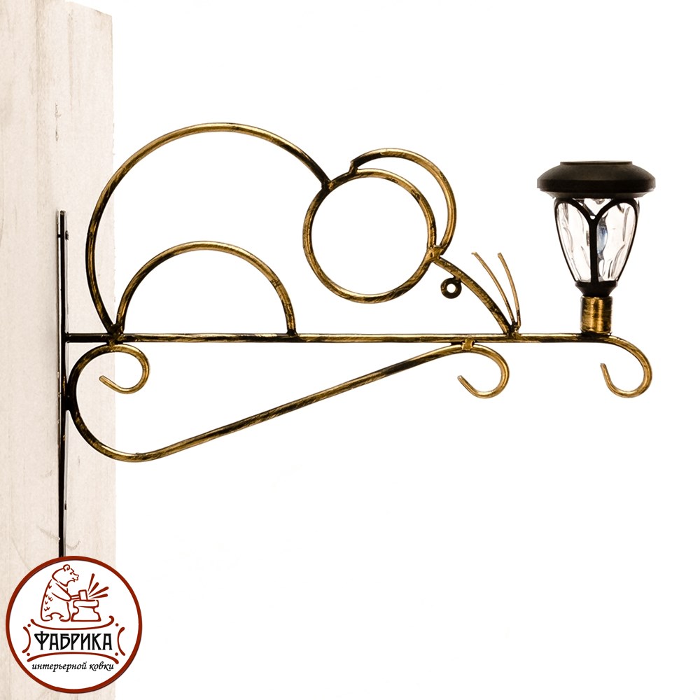 Кронштейн для цветов 52-304 и подвесных кашпо с фонариком, изготовленный из прочного, кованого металла. Данная модель крепится к стенам с помощью шурупов.