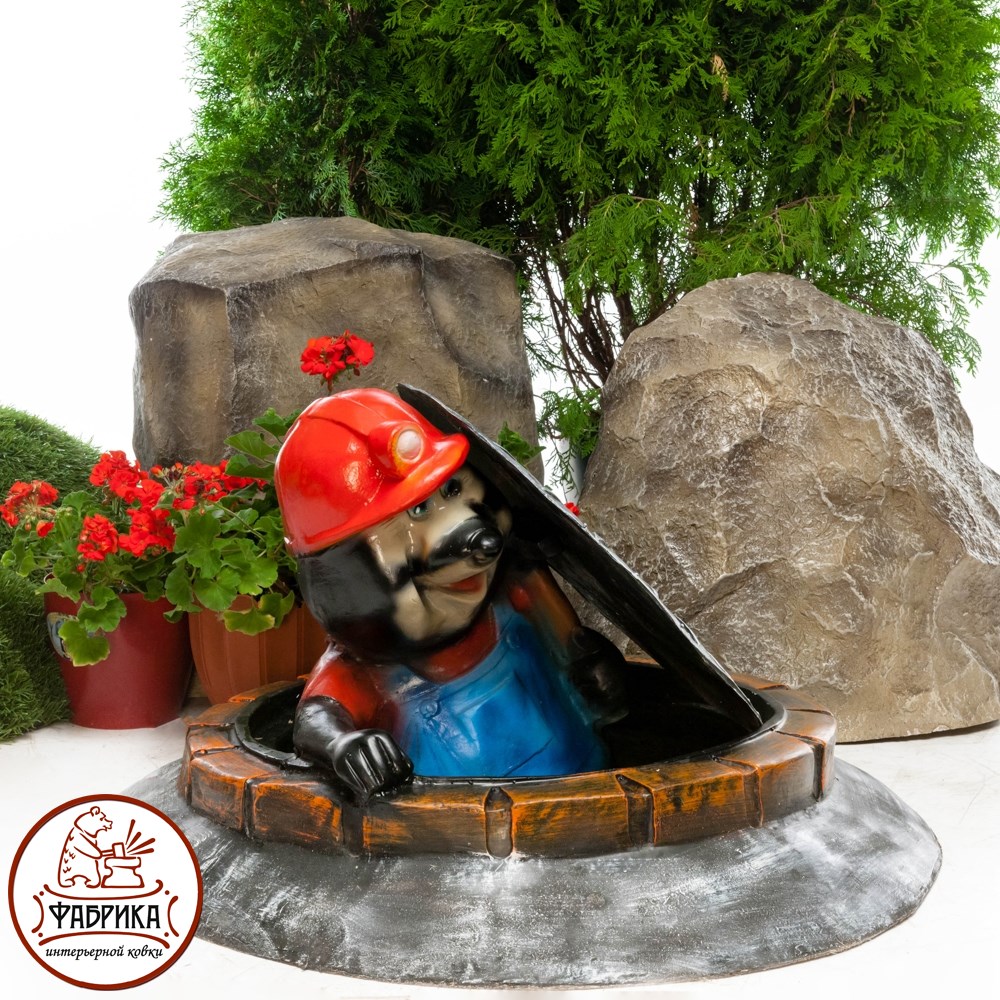 Крышка люка изготовлена из ударопрочного, стойкого к атмосферным воздействиям материала - стеклопластика. Покрыта особопрочной двухкомпонентной краской. Устойчива к солнечным лучам, воздействию влаги и низких температур. Диаметр в 90 см. гарантированно закроет большинство садовых технических отверстий. Веселый образ Крота-шахтера, понравится всей Вашей семье, особенно маленьким детям.