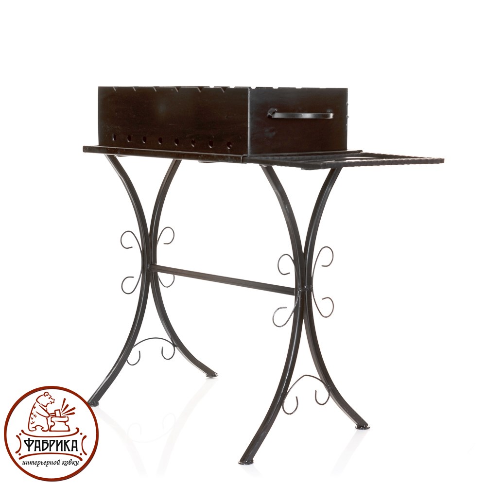 Кованый мангал 861-10 с изящными коваными ножками. А специальная подставка для дров внизу, поможет сохранить дрова в сухости. Конструкция из кованого металла украшена изящной ажурной ковкой.