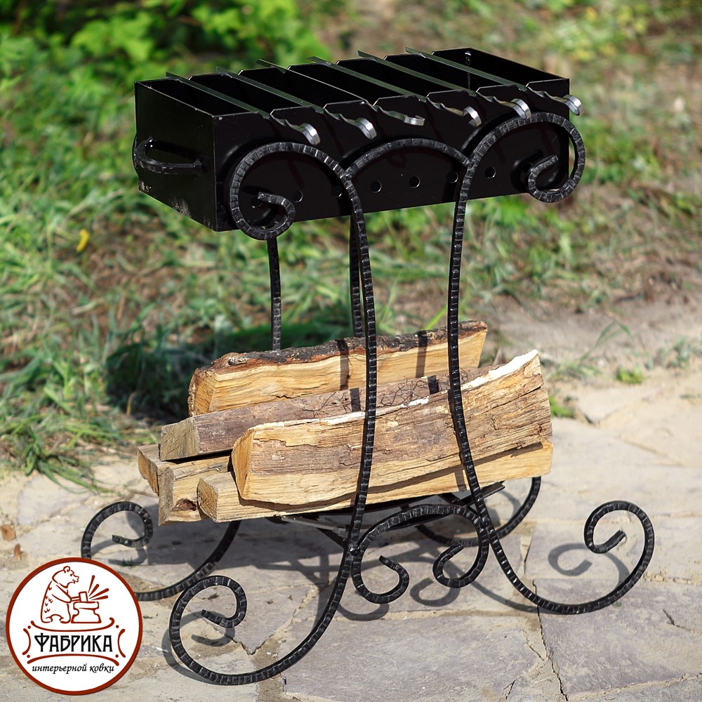 Кованый мангал 861-13 с изящными коваными ножками. А специальная подставка для дров внизу, поможет сохранить дрова в сухости. Конструкция из кованого металла украшена изящной ажурной ковкой.