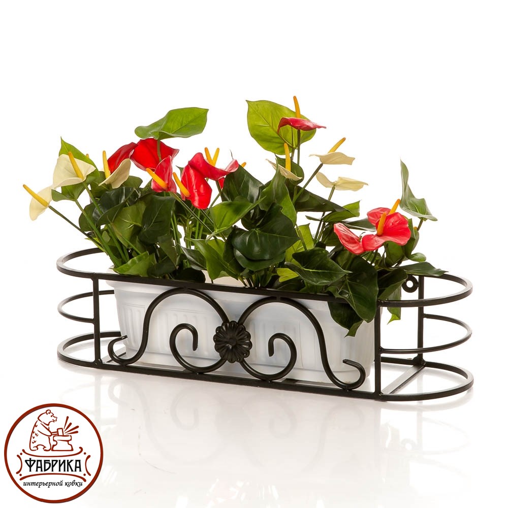 Подставка за окно для цветов изготовлена из металла и украшена изящными коваными деталями. Крепится с помощью шурупов к вертикальной поверхности.