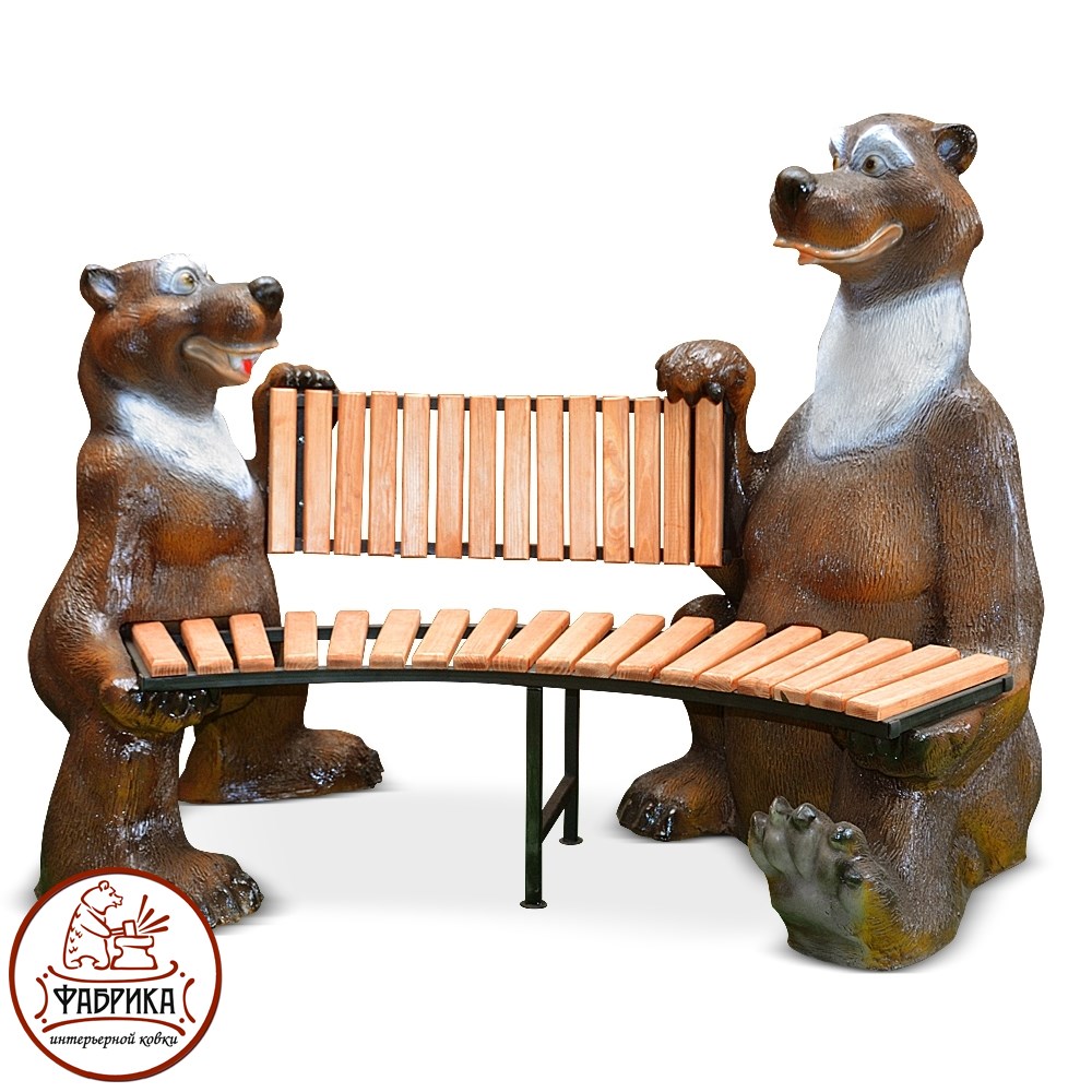 Разборная скамейка со спинкой. Фигуры изготовлены из стеклопластика. Скамейка из дерева на металлическом каркасе. Имеется одна дополнительная опора для более устойчивого нахождения на ровной поверхности. Скамейка крепится к фигурам  с помощью шурупов, которые входят в комплект.