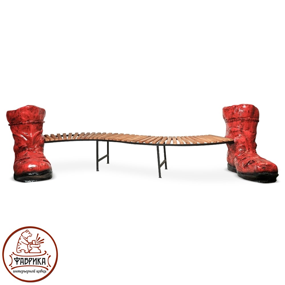 Скамейка сапоги. Фигуры сапог изготовлены из стеклопластика. Скамейка имеет изогнутый вид и две опоры снизу для устойчивого нахождения на поверхности. Скамейка является разборной и крепится к фигурам сапог шурупами, входящих в комплект.