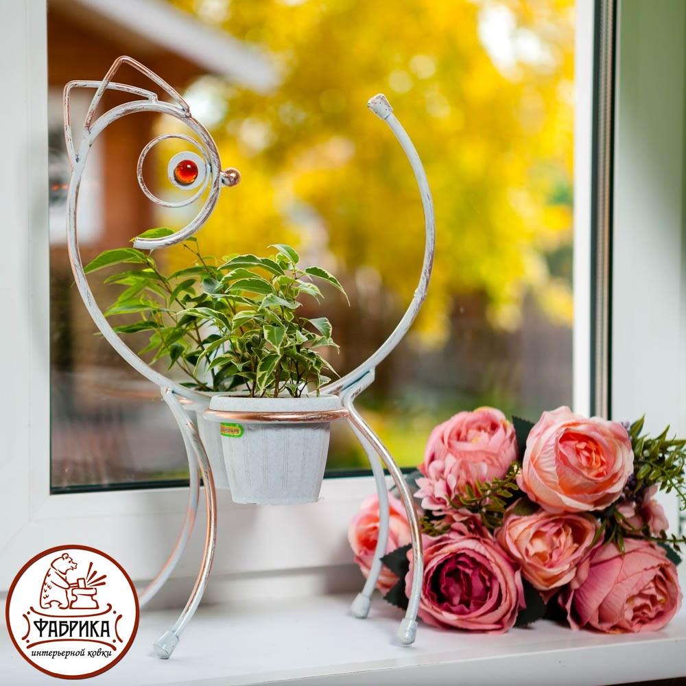Подставка для цветов на окно из металла. Цветочница в виде кошки смотрится красиво и изящно, благодаря своим небольшим габаритам и утончённому оформлению. Предназначена для размещения двух цветочных горшков.