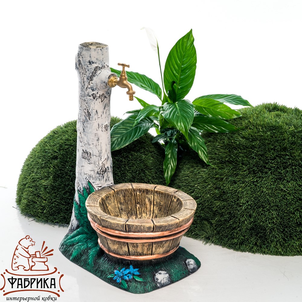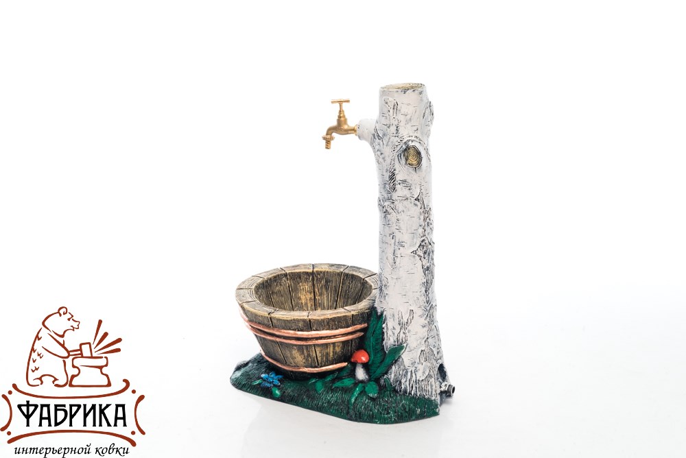 Стильный умывальник для дачи или сада, изготовленный из стеклопластика, легкий и удоропрочный. И представляет из себя кран, с имитацией под бронзу, прикрепленный к массивному квадратному брусу и дубовую кадушку с металлическими обручами.
