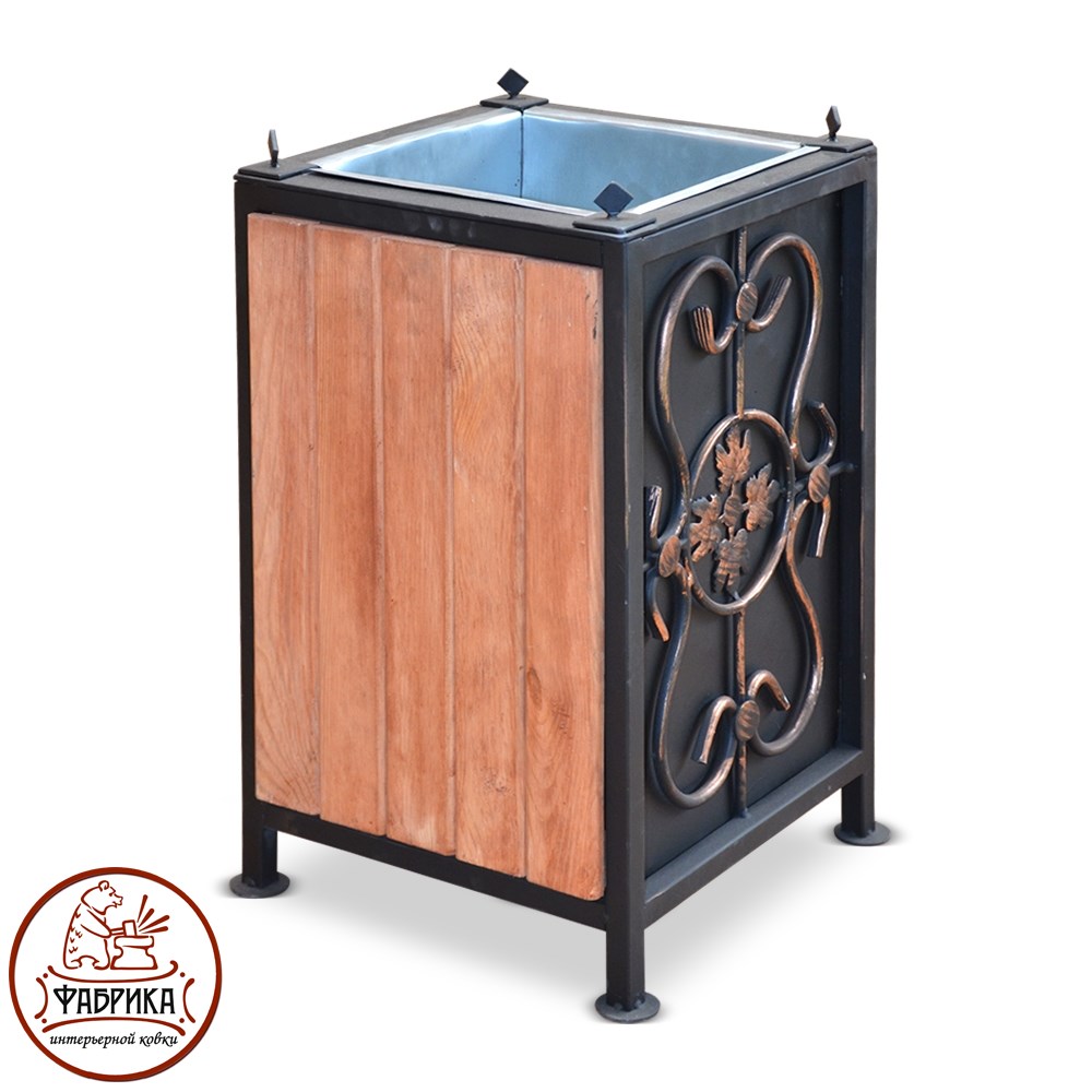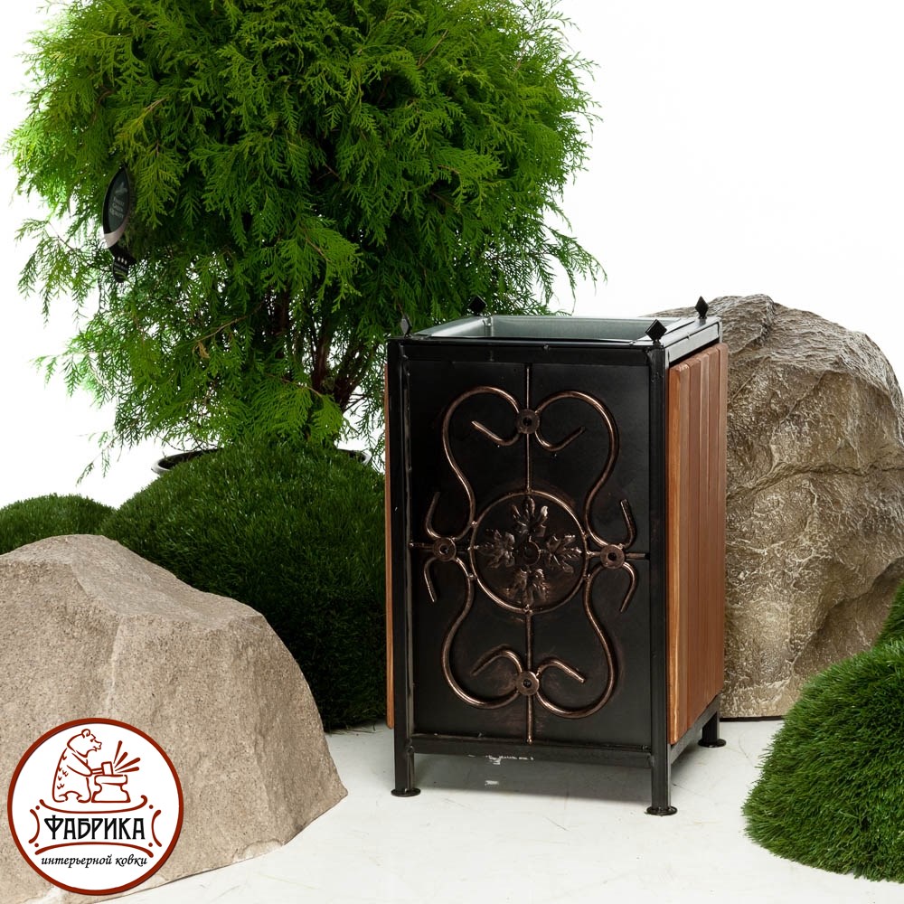 Урна 59-308 изготовлена из прочного металлического каркаса, на который крепятся деревянные бруски. Имеются декоративные элементы. Для данной модели предусмотрено жесткое крепление к основанию или бетонирования, что обеспечивает сохранность урны и препятствует опрокидыванию. Для удобства уборки, урна оборудована съемным контейнером.